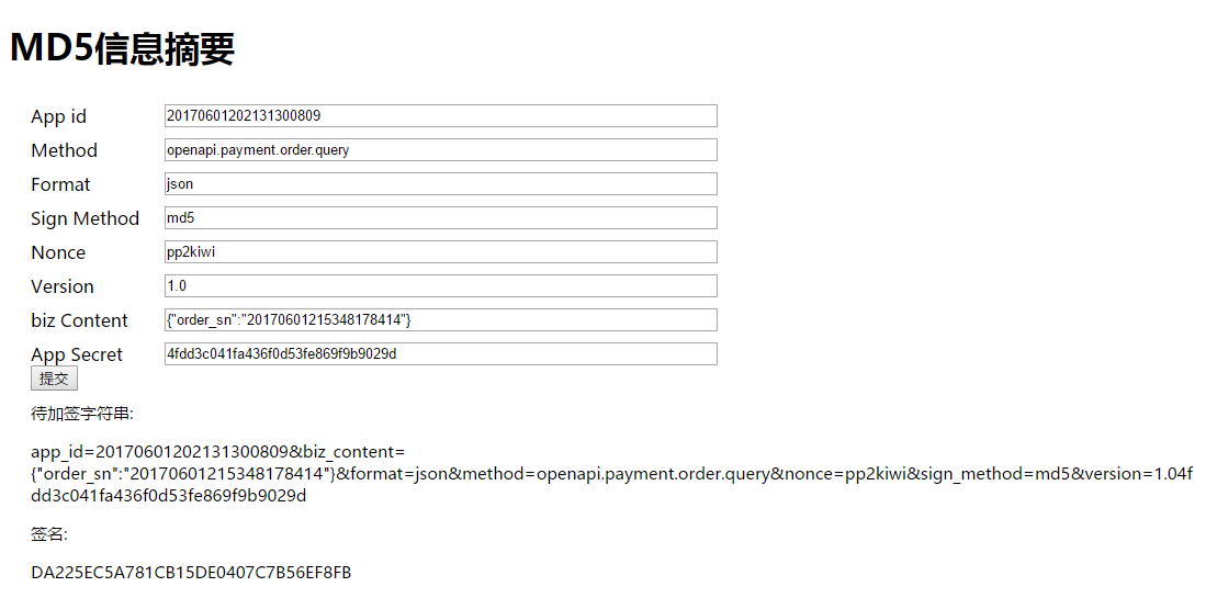 提醒: 进行MD5加密时biz_content内的参数能用\转译字符,但是发送请求参数时,biz_content内的参数需要用\转译。